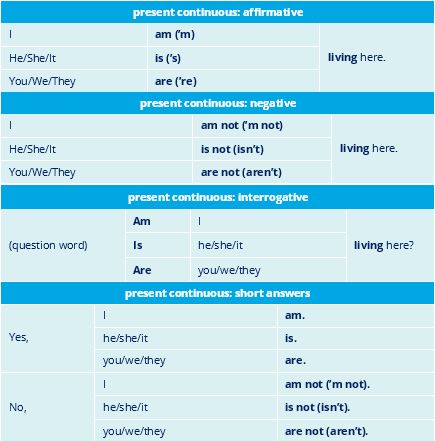 Na slici možemo videti kako se gradi potvrdni, upitni i odrični oblik u sadašnjem trajnom vremenu na primeru glagola to live (živeti), po licima.