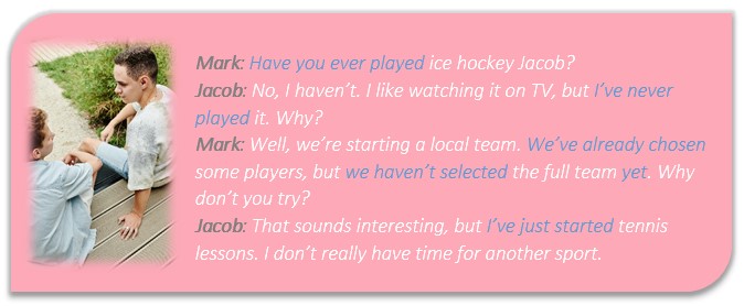 Jacob: I've just started tennis lessons. (Upravo sam krenuo na časove tenisa.) → Džejkob je nedavno počeo da se bavi tenisom i trenutno ga igra, pa nema vremena da se bavi još nekim sportom. Dakle, i on govori o nedavno završenoj radnji koja ima rezultat u sadašnjosti.